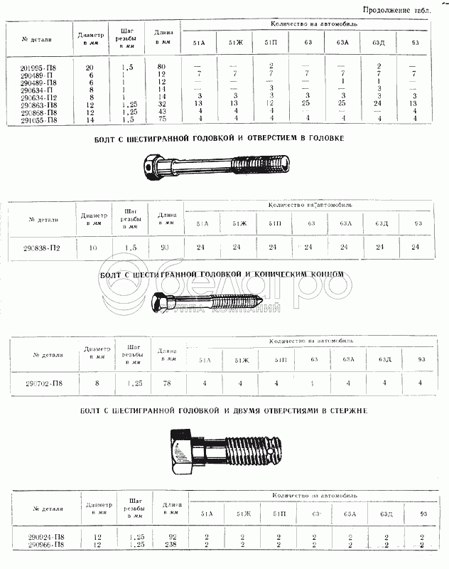 Каталог запасных частей к технике: ГАЗ-51 (63, 93). Болты с шестигранной головкой