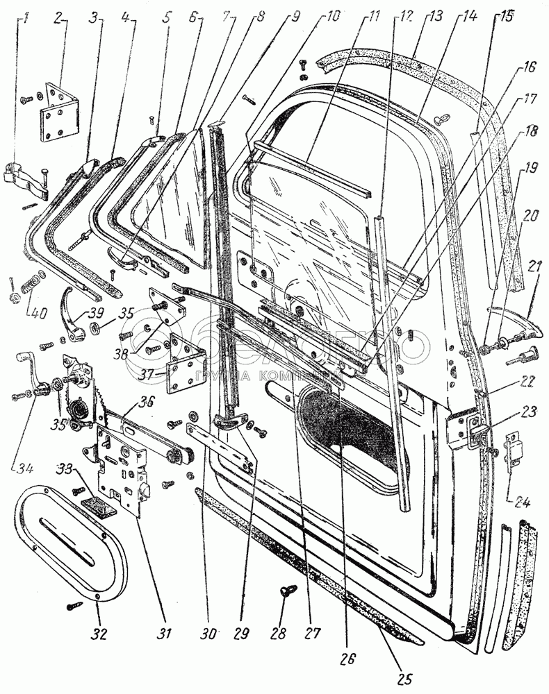 Обойма уплотнителя поворотного стекла двери в сборе с кронштейнами левая
