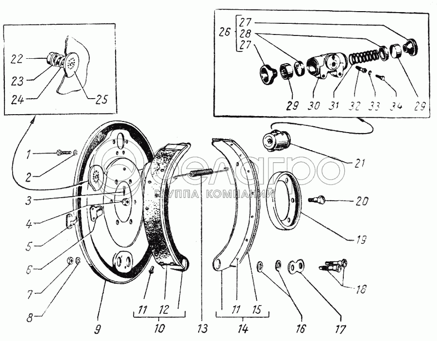Детали для колесного цилиндра переднего тормоза (комплект состоит из деталей 51-3501051 и 51-3501058)