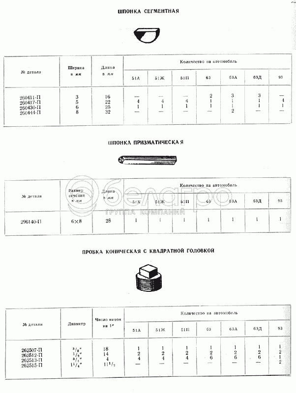 Каталог запасных частей к технике: ГАЗ-51 (63, 93). Шпонки, пробки