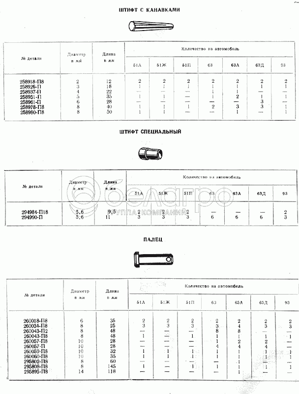 Каталог запасных частей к технике: ГАЗ-51 (63, 93). Штифты, пальцы