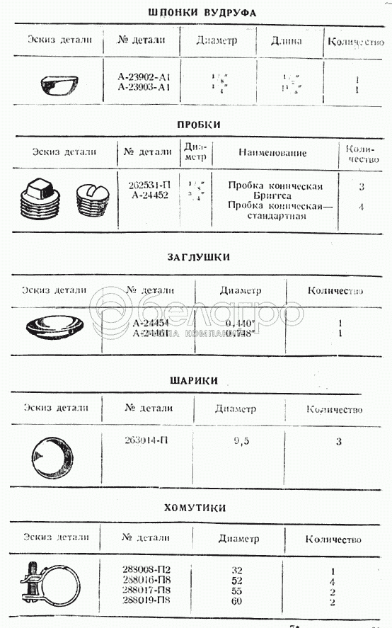 Каталог запасных частей к технике: ГАЗ-ММ "Полуторка". Шпонки, пробки, заглушки, шарики, хомутики
