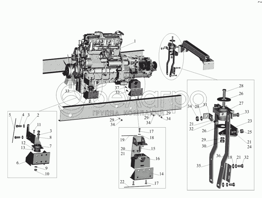 Каталог запасных частей к технике: МАЗ-437030 (Зубренок). Крепление двигателя 437030-1001002
