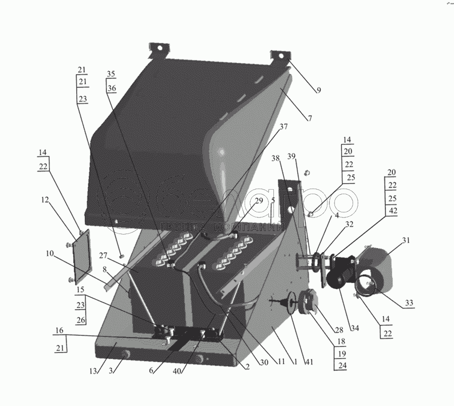 Каталог запасных частей к технике: МАЗ-437030 (Зубренок). Установка аккумуляторных батарей 437040-3700008