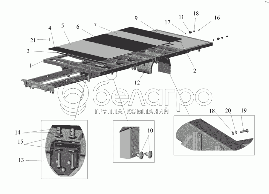 Каталог запасных частей к технике: МАЗ-437030 (Зубренок). Установка основания, панелей настила, брызговиков