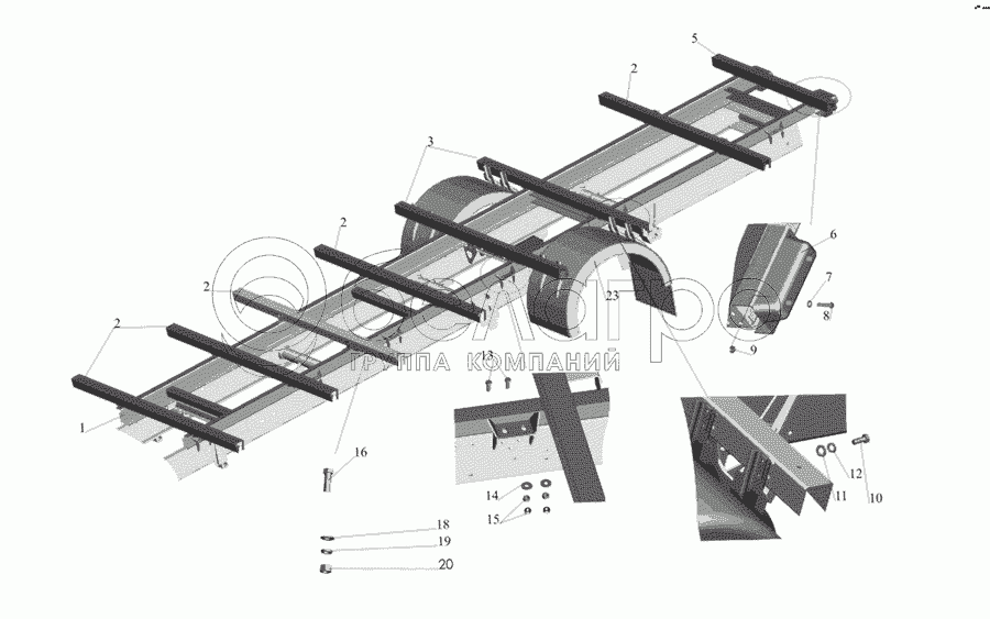 Каталог запасных частей к технике: МАЗ-437030 (Зубренок). Установка основания и брызговиков