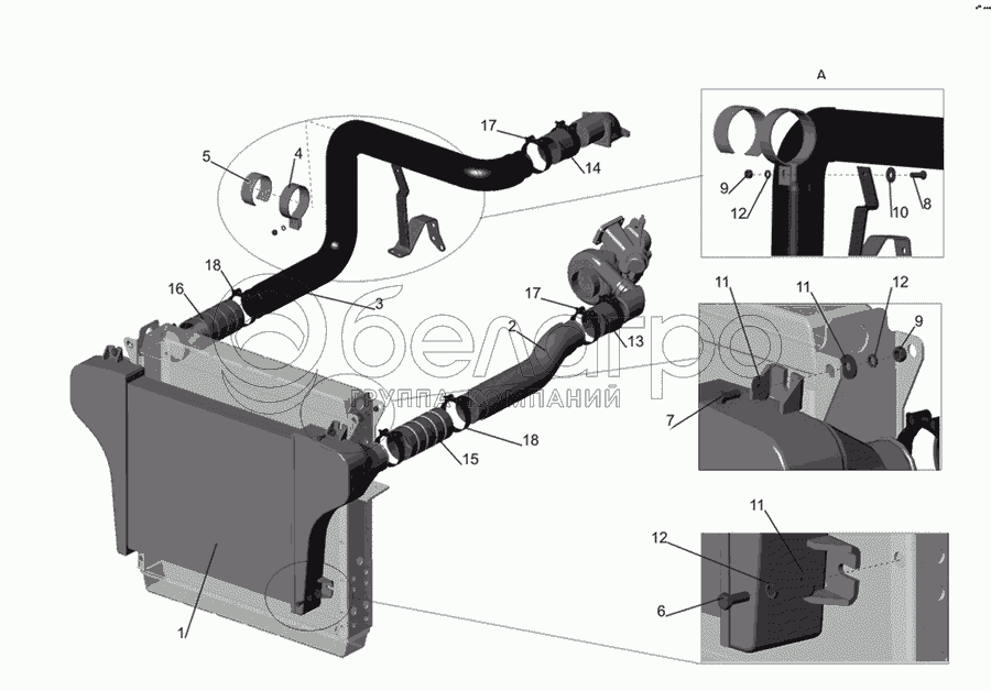 Каталог запасных частей к технике: МАЗ-437030 (Зубренок). Установка системы охлаждения наддувочного воздуха