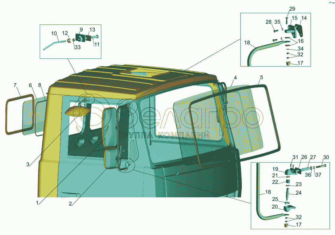 Каталог запасных частей к технике: МАЗ-437040 (Зубренок). Установка стекол и зеркал