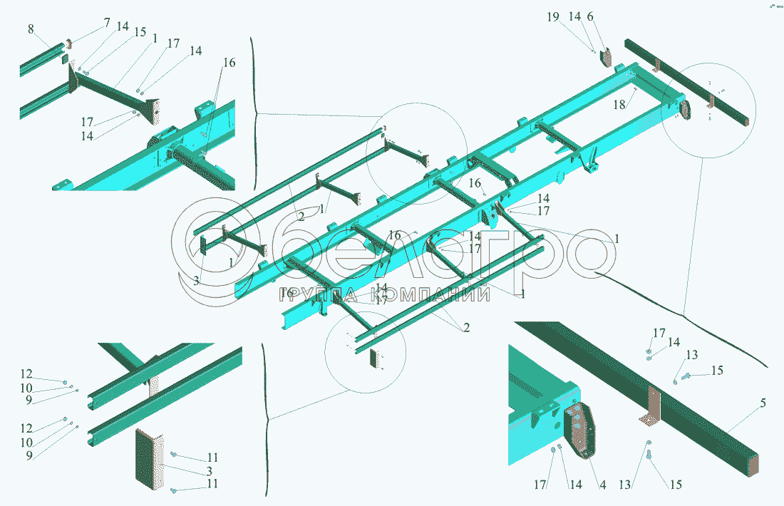 Каталог запасных частей к технике: МАЗ-437040 (Зубренок). Установка бокового ограждения и заднего бампера