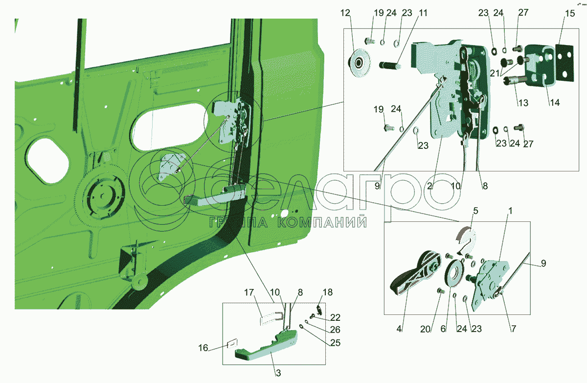 Каталог запасных частей к технике: МАЗ-437040 (Зубренок). Установка наружной ручки и замка двери