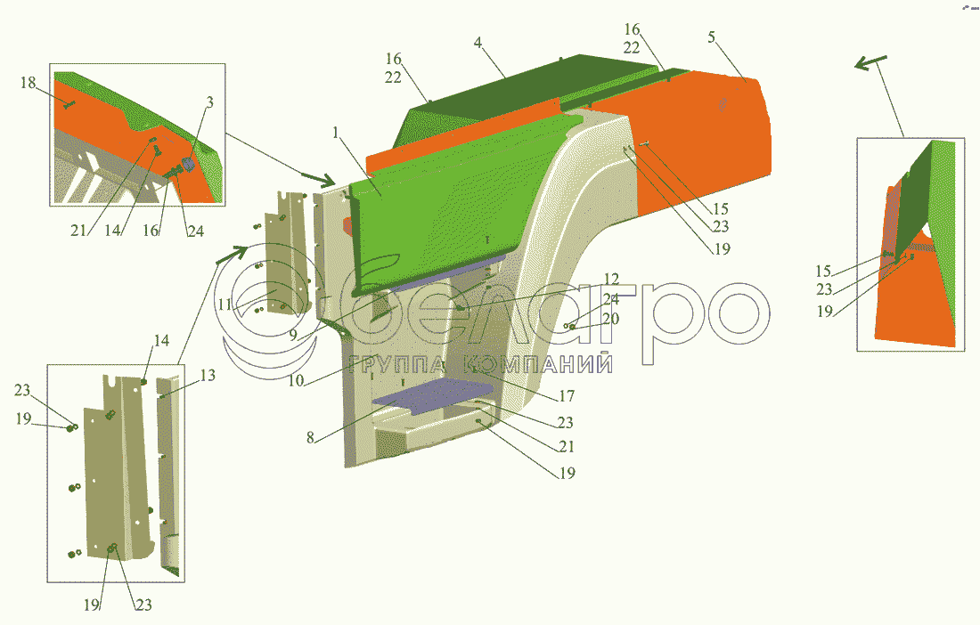 Каталог запасных частей к технике: МАЗ-437040 (Зубренок). Установка оперения 4371-8400020-010