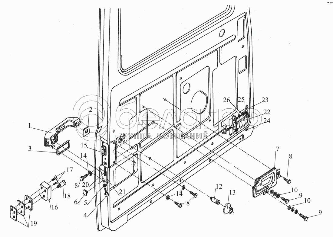 Каталог запасных частей к технике: МАЗ-437040 (Зубренок). Установка ручек, замка и ограничителя двери