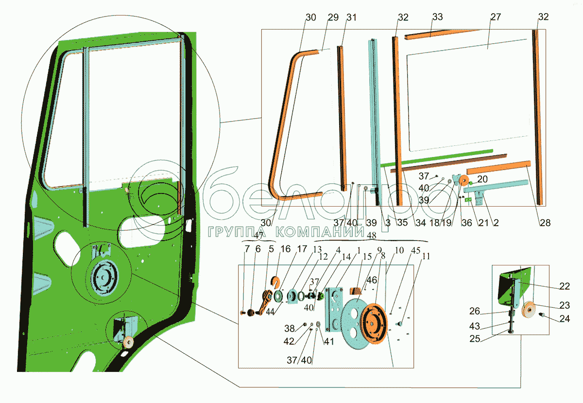 Каталог запасных частей к технике: МАЗ-437040 (Зубренок). Установка стеклоподъемника и ручки стеклоподъемника