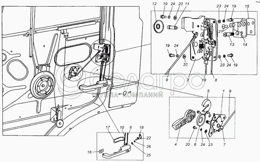 Каталог запасных частей к технике: МАЗ-437040 (Зубренок). Установка наружной ручки и замка двери