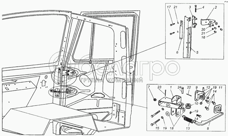 Каталог запасных частей к технике: МАЗ-437040 (Зубренок). Установка ограничителя и петель двери