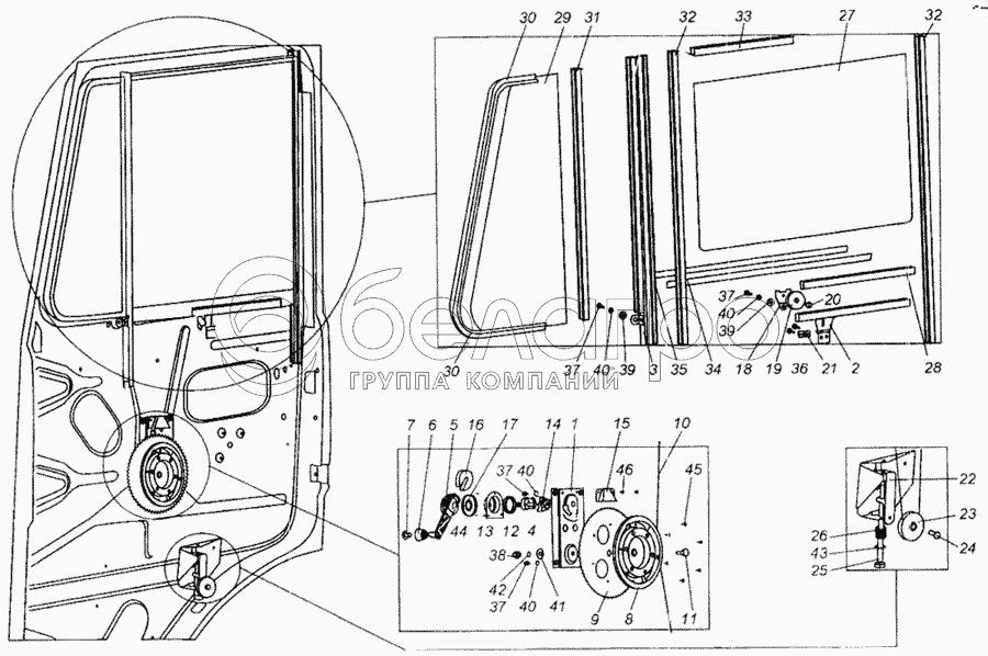 Каталог запасных частей к технике: МАЗ-437040 (Зубренок). Установка стеклоподъемника и ручки стеклоподъемника