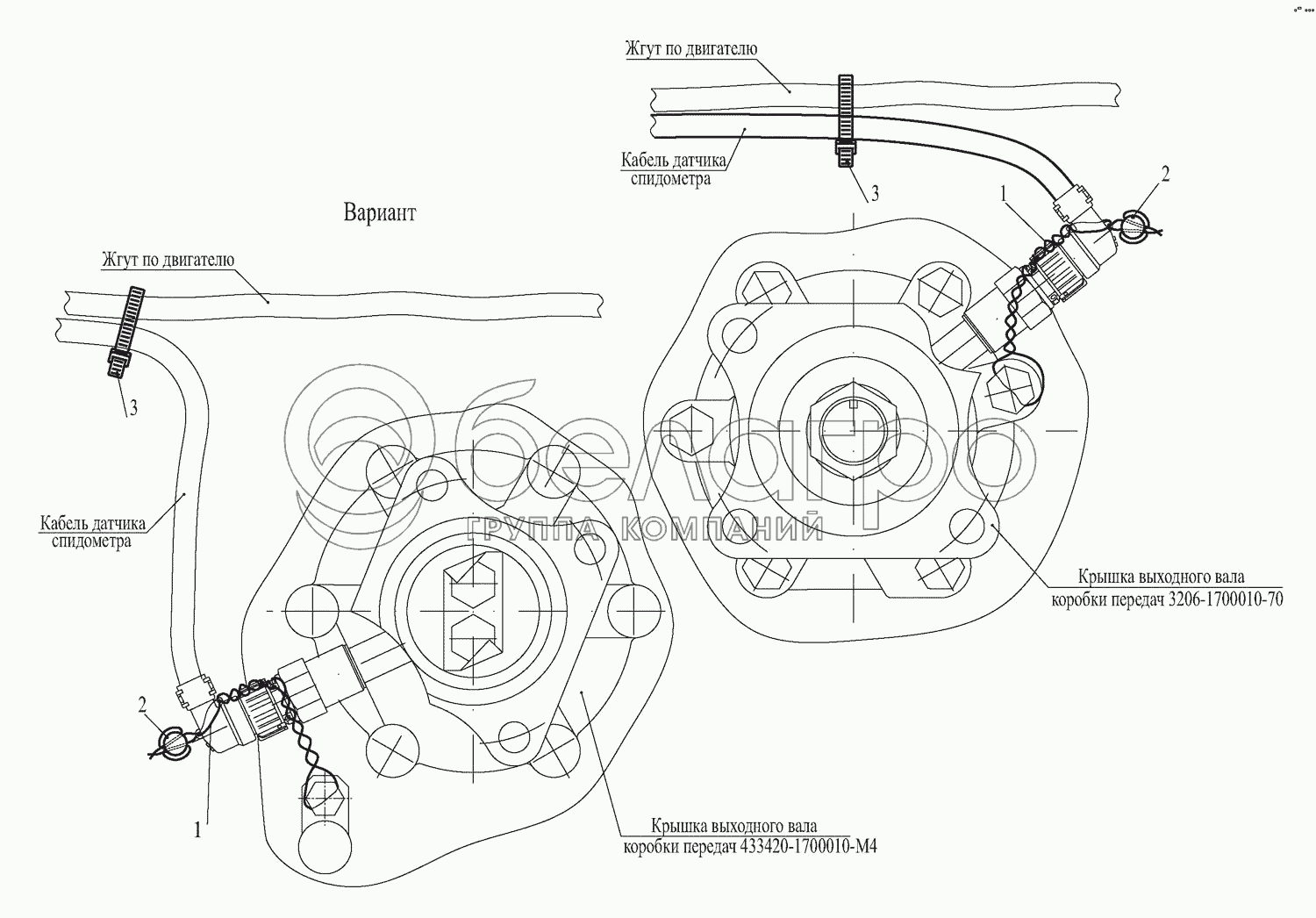 Каталог запасных частей к технике: МАЗ-437043 (Зубренок). Установка датчика спидометра 437041-3800006-002