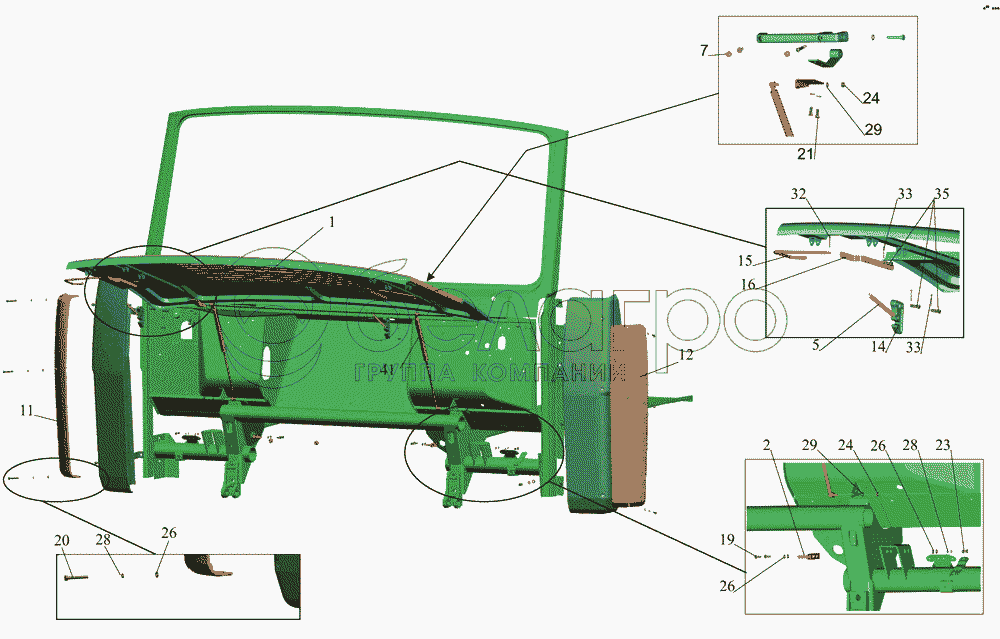 Каталог запасных частей к технике: МАЗ-437043 (Зубренок). Установка облицовки передка 64221-8400018