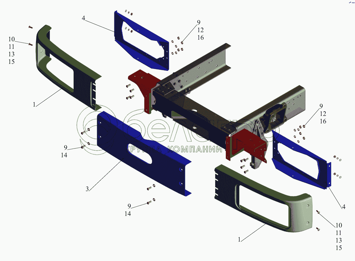 Каталог запасных частей к технике: МАЗ-437043 (Зубренок). Установка переднего бампера 4370-2803006