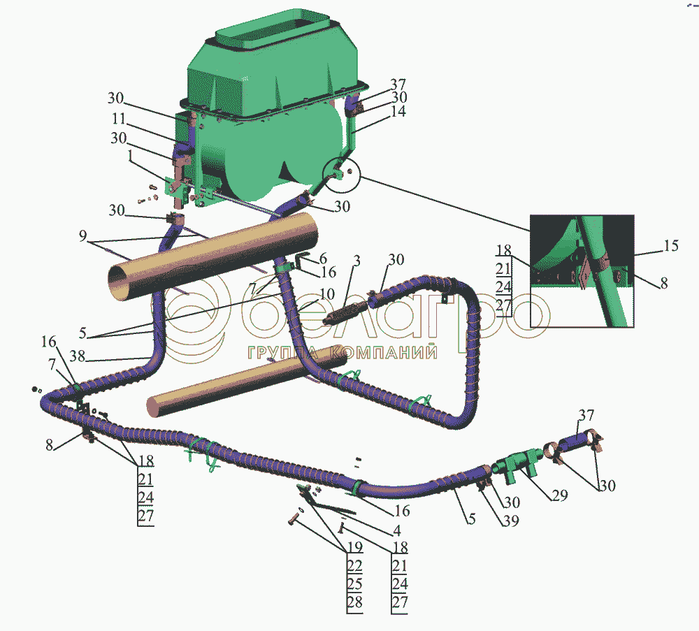Каталог запасных частей к технике: МАЗ-437043 (Зубренок). Установка шлангов отопителя 437040-8100006-010