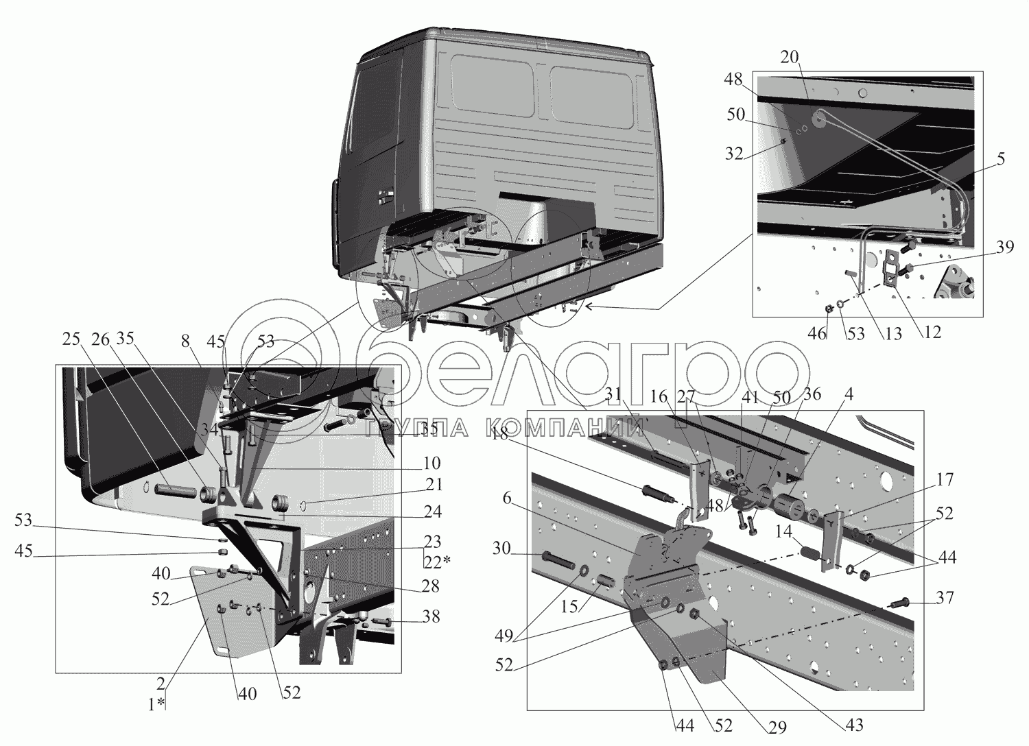 Каталог запасных частей к технике: МАЗ-437130 (Зубренок). Крепление кабины к раме 4371-5000004