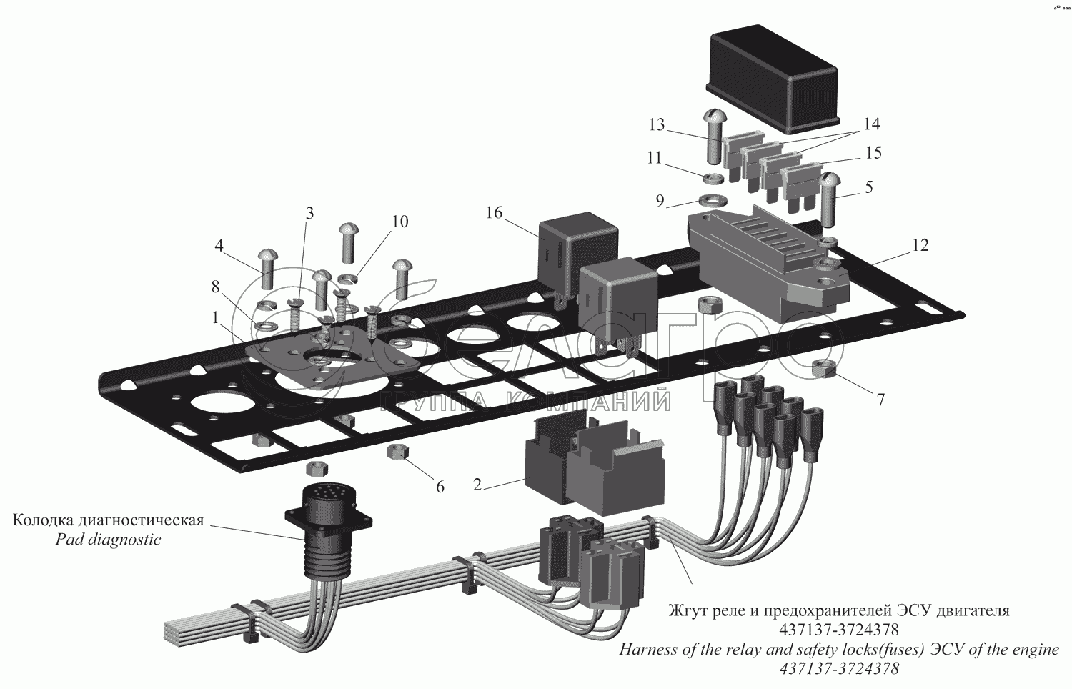 Каталог запасных частей к технике: МАЗ-437130 (Зубренок). Панель реле и предохранителей ЭСУ двигателя