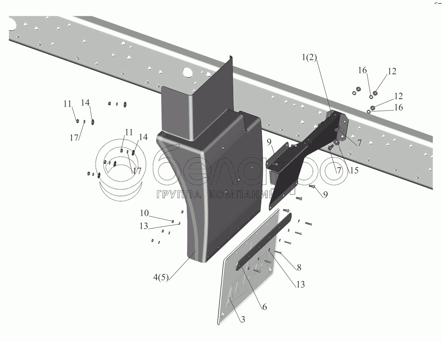 Каталог запасных частей к технике: МАЗ-437130 (Зубренок). Установка брызговиков передних колес 4371-8400030