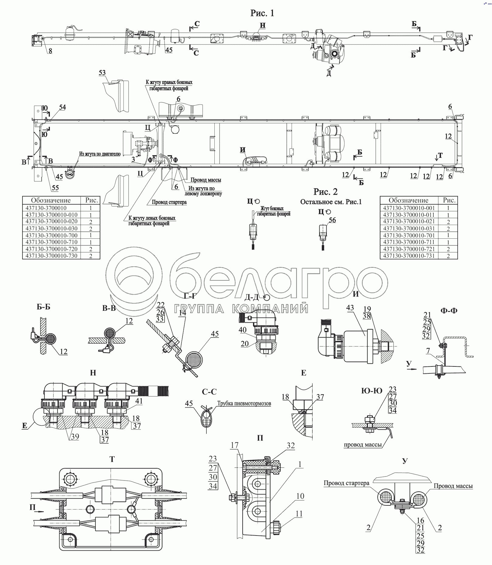 Каталог запасных частей к технике: МАЗ-437130 (Зубренок). Установка электрооборудования на шасси