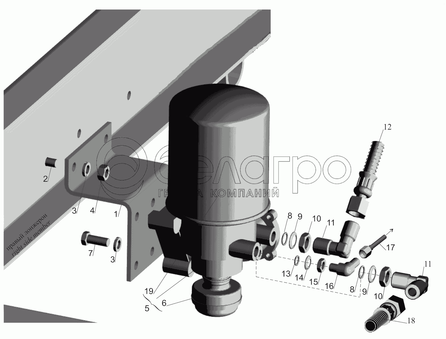 Каталог запасных частей к технике: МАЗ-437130 (Зубренок). Установка осушителя воздуха 5551-3536004