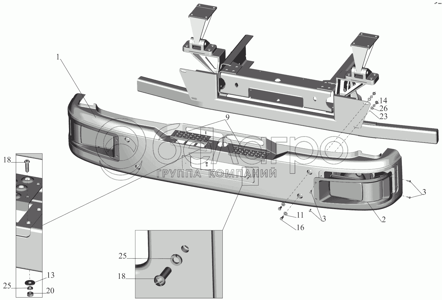 Каталог запасных частей к технике: МАЗ-437130 (Зубренок). Установка верхнего бампера 437140-2800003