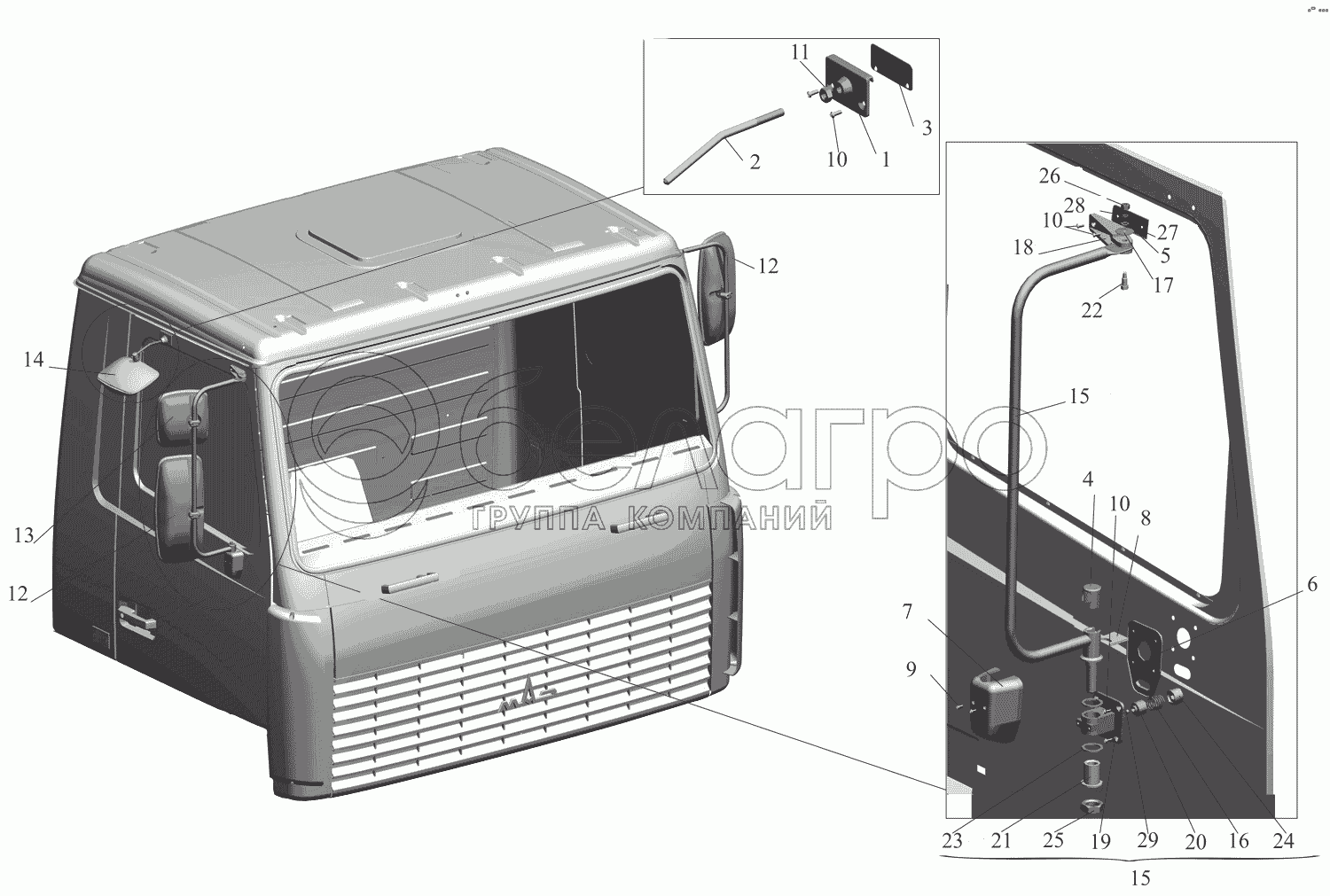 Каталог запасных частей к технике: МАЗ-437130 (Зубренок). Установка зеркал 6430-8200005