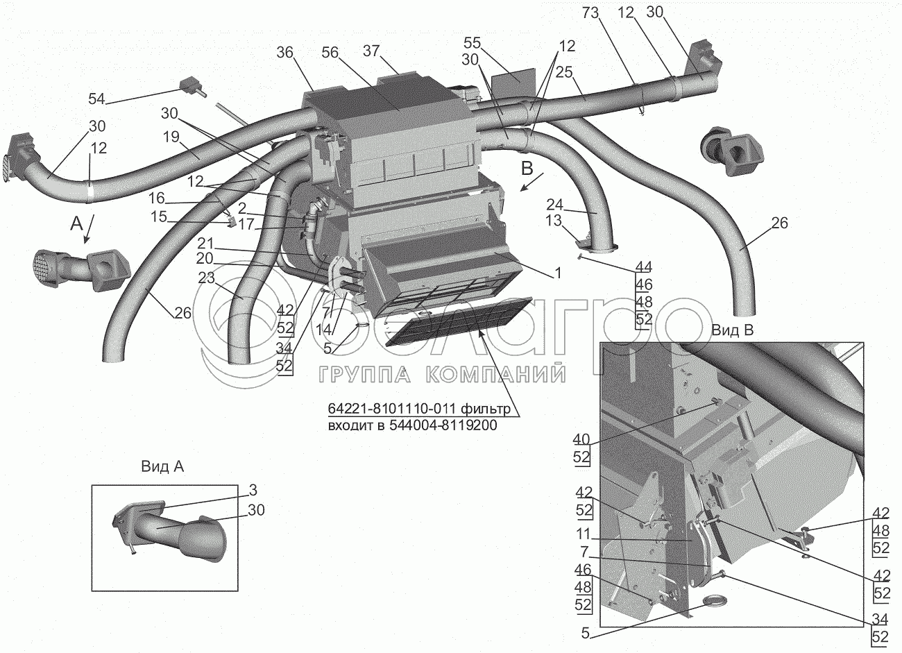 Каталог запасных частей к технике: МАЗ-4371P2-0000421-000. Установка отопителя 631019-8100001