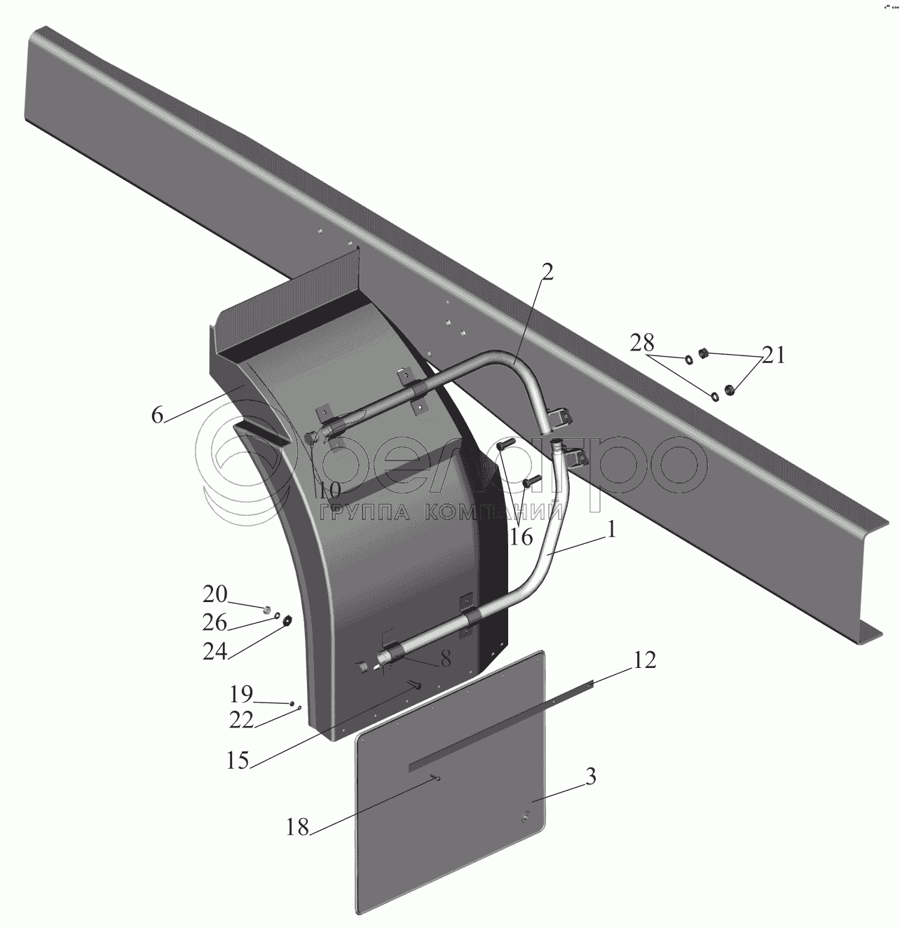 Каталог запасных частей к технике: МАЗ-530905. Установка брызговиков передних колес 5309-8400030