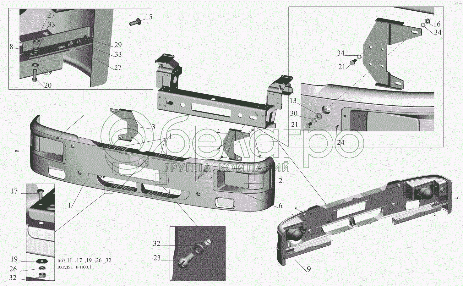 Каталог запасных частей к технике: МАЗ-530905. Установка переднего бампера 6418-2800003