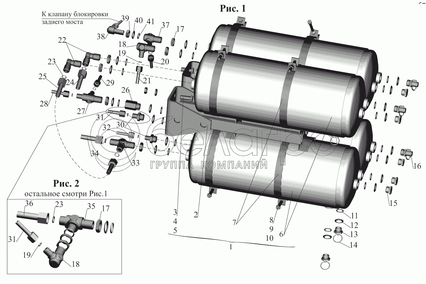 Каталог запасных частей к технике: МАЗ-530905. Установка ресиверов 530905-3513004 и присоединительной арматуры