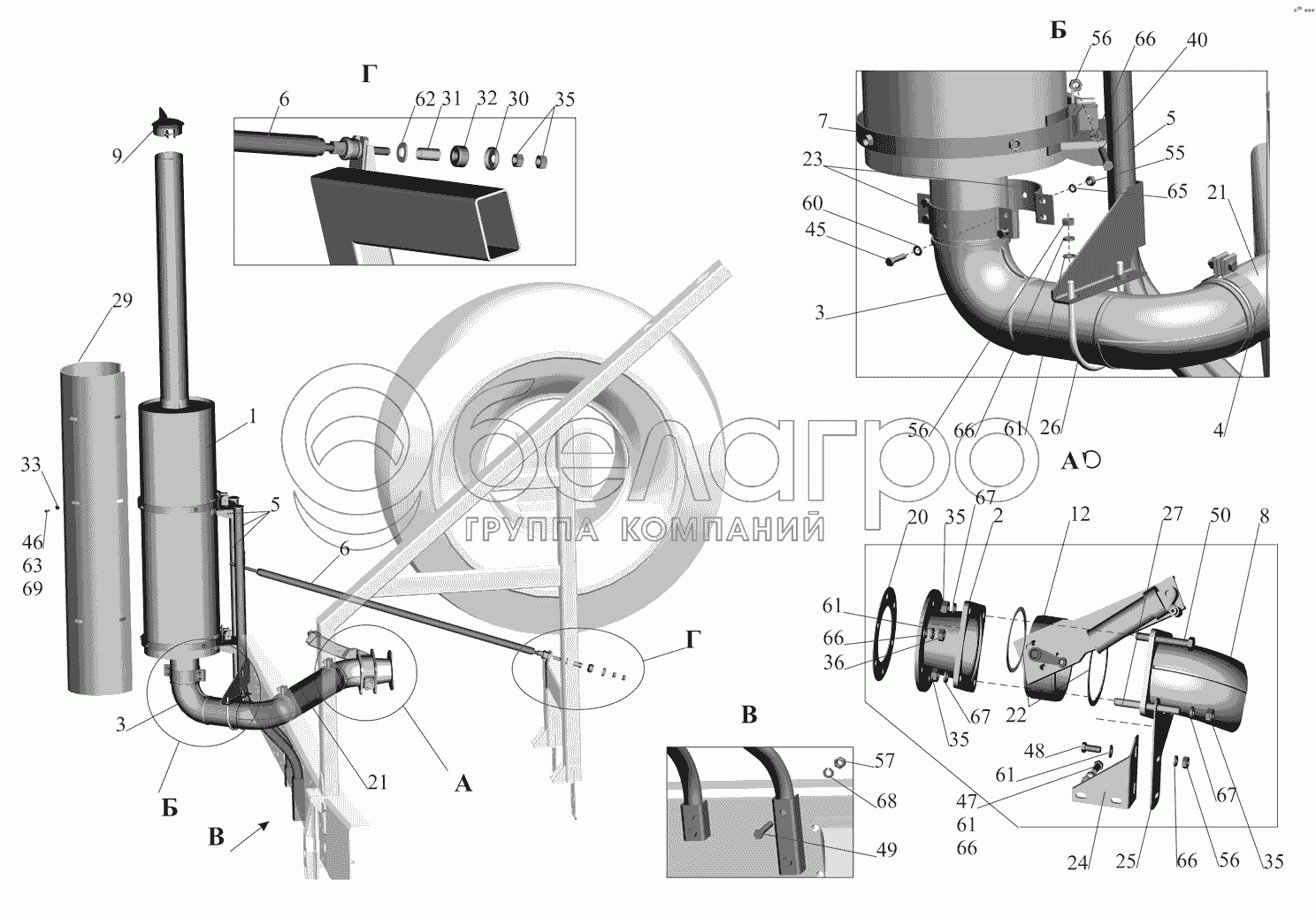 Каталог запасных частей к технике: МАЗ-530905. Установка системы выпуска газов 530905-1200001-030