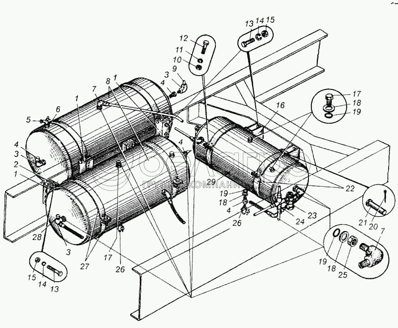 Каталог запасных частей к технике: МАЗ-5335. Крепление воздушных баллонов автомобиля МАЗ-5335