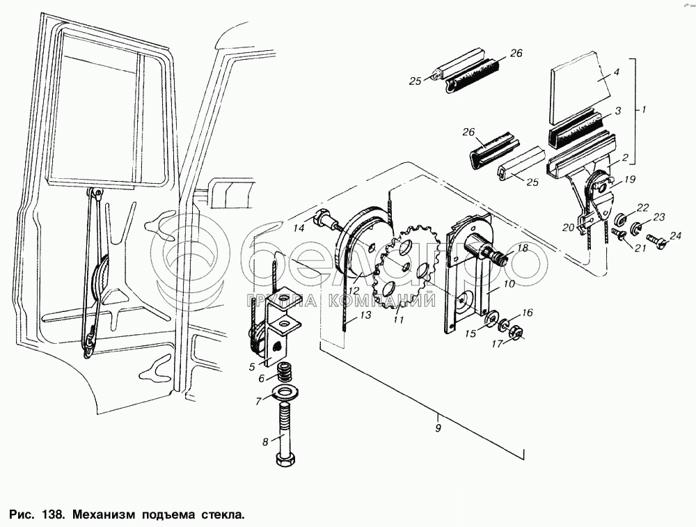 Каталог запасных частей к технике: МАЗ-53363. Механизм подъема стекла