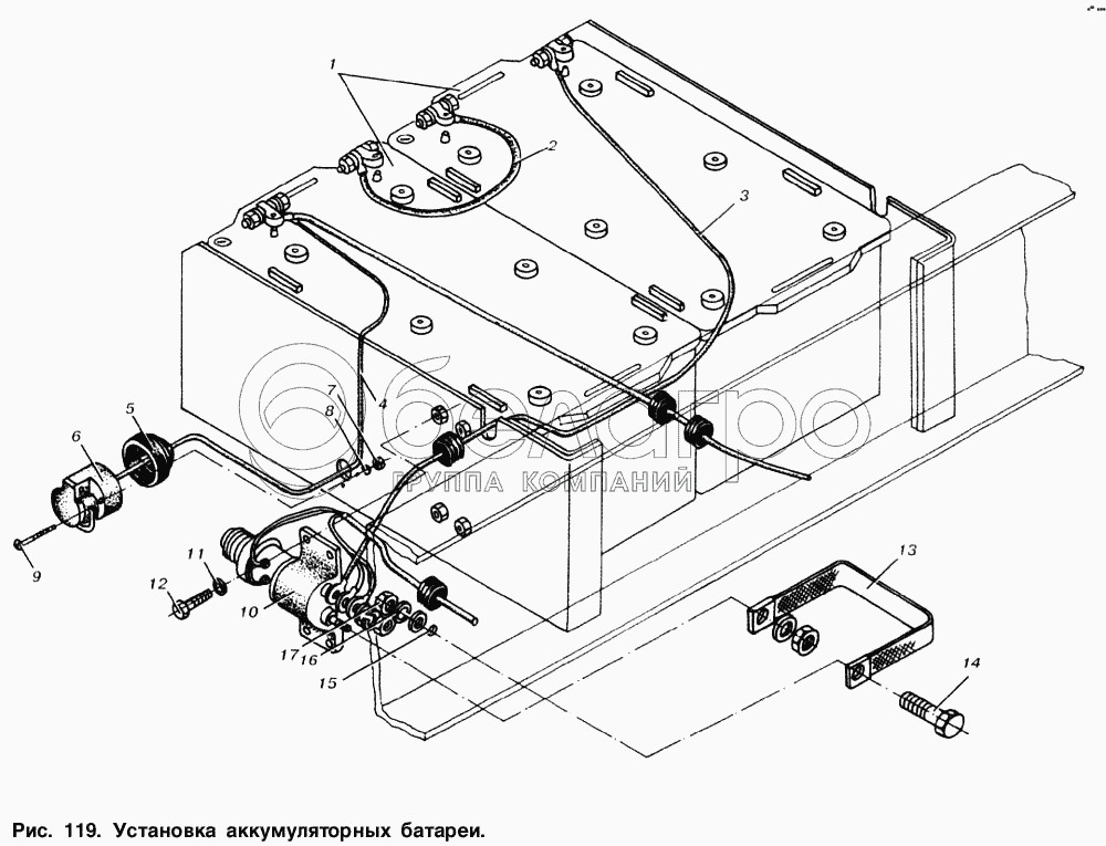 Каталог запасных частей к технике: МАЗ-53363. Установка аккумуляторной батареи