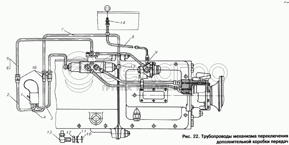Каталог запасных частей к технике: МАЗ-53366. Трубопроводы механизма переключения дополнительной коробки передач