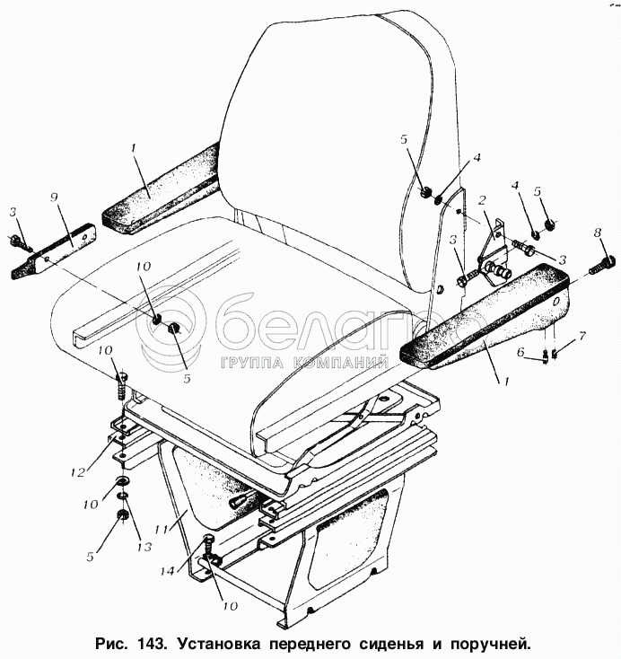 Каталог запасных частей к технике: МАЗ-53366. Установка переднего сиденья и поручней