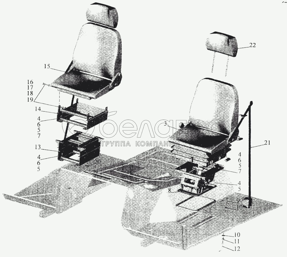 Каталог запасных частей к технике: МАЗ-5336. Установка и пневмопитание сидений автомобиля МАЗ-533702