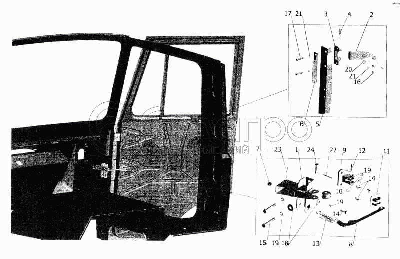 Каталог запасных частей к технике: МАЗ-5336. Установка ограничителя и петель двери
