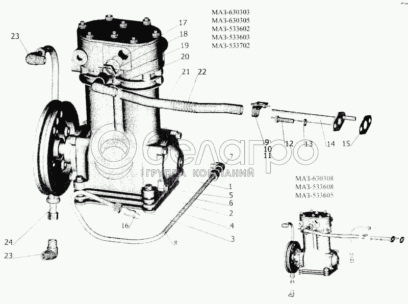 Каталог запасных частей к технике: МАЗ-5336. Установка пневмокомпрессора