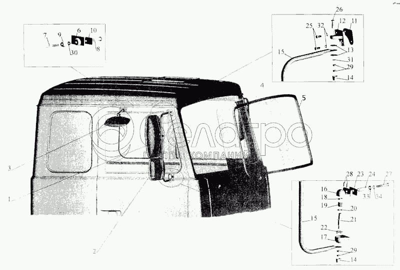 Каталог запасных частей к технике: МАЗ-5336. Установка стекол и зеркал на большую кабину
