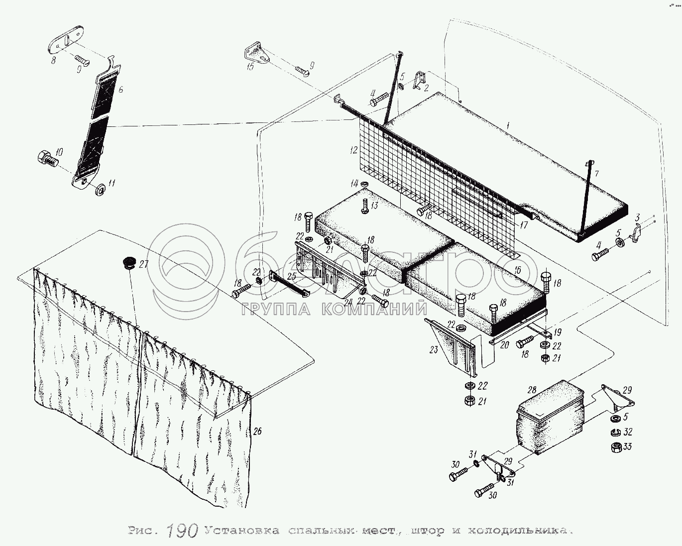 Каталог запасных частей к технике: МАЗ-53371. Установка спальных мест, штор и холодильника