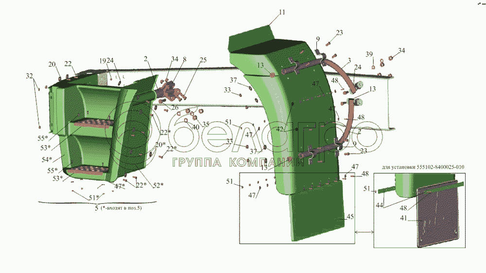 Каталог запасных частей к технике: МАЗ-533731. Установка брызговиков передних колес