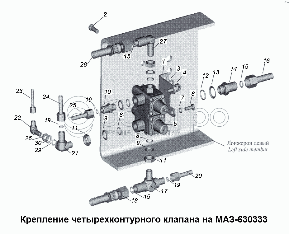 Каталог запасных частей к технике: МАЗ-533731. Крепление четырехконтурного клапана на МАЗ-630333