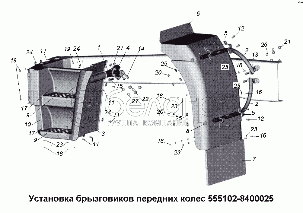 Каталог запасных частей к технике: МАЗ-533731. Установка брызговиков передних колес 555102-8400025
