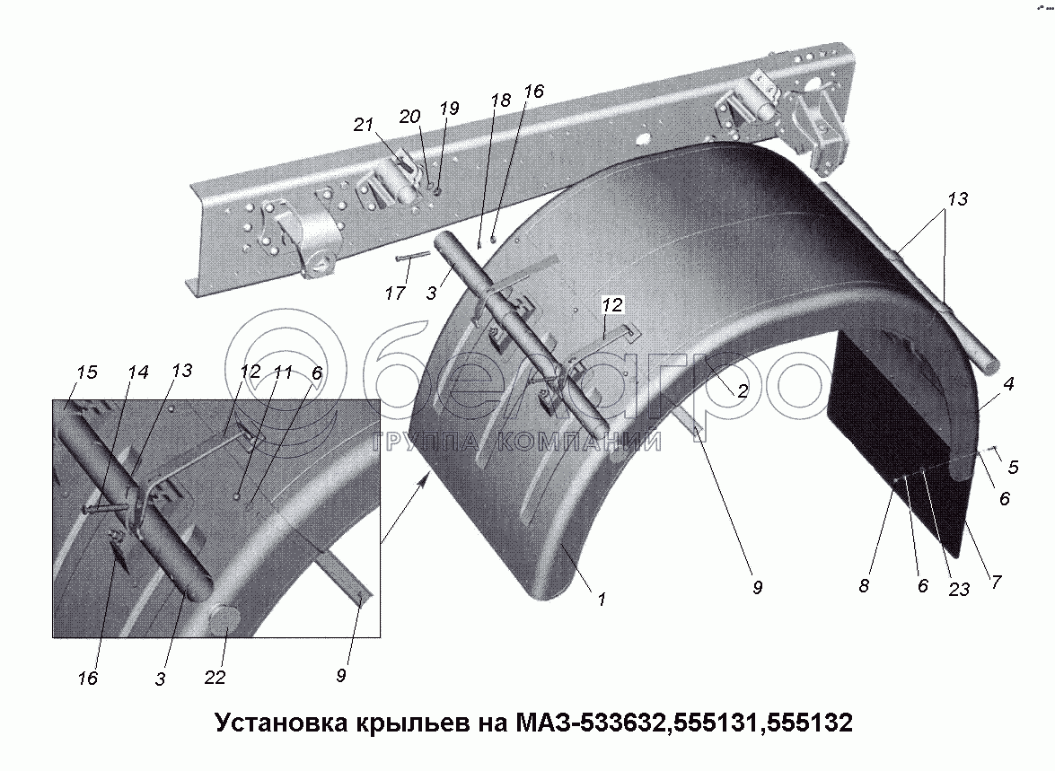 Каталог запасных частей к технике: МАЗ-533731. Установка крыльев на МАЗ-533632, 555131, 555132